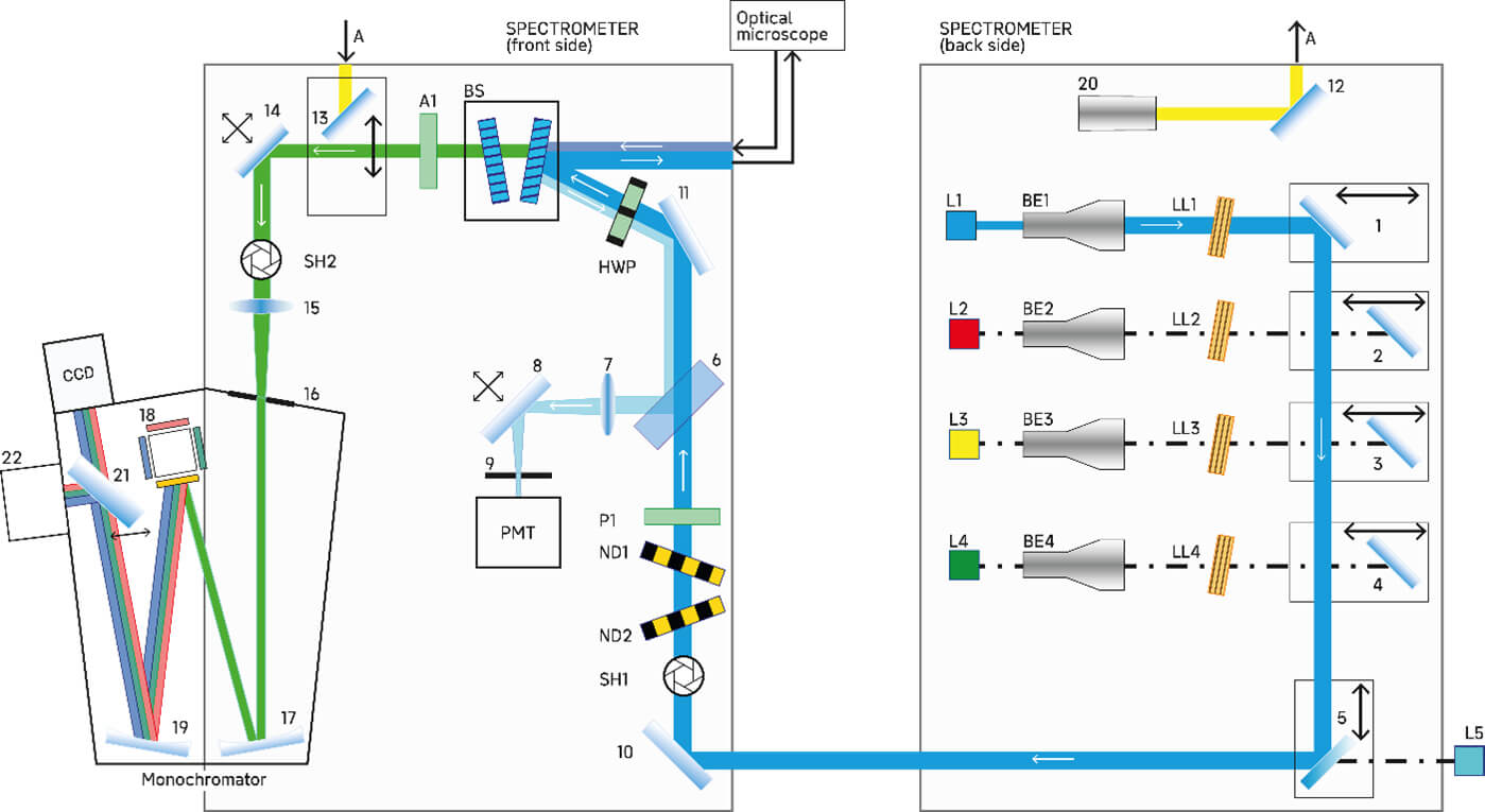 The LS RamBo 620 microspectrometer is equipped with a high-precision motorized scanning stage and/ or motorized scanning mirrors for 2D/ 3D point-to-point mapping of spectra from a given area/ volume of the sample (Raman mapping).